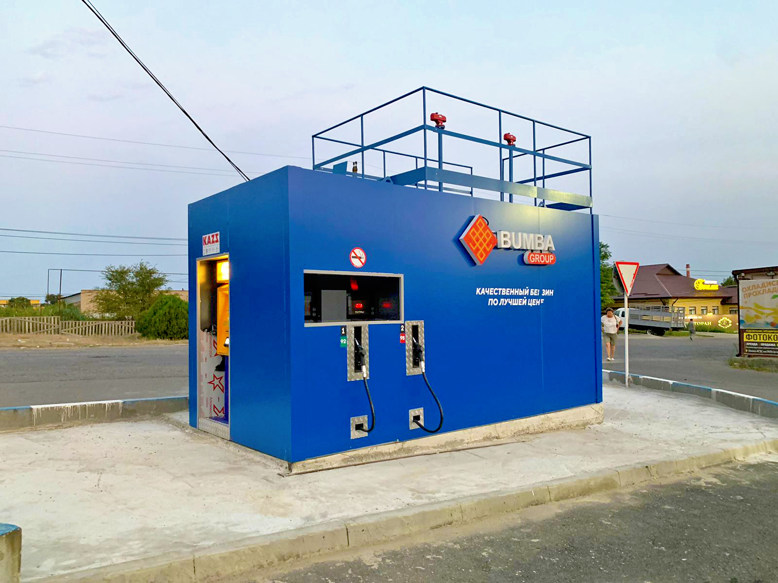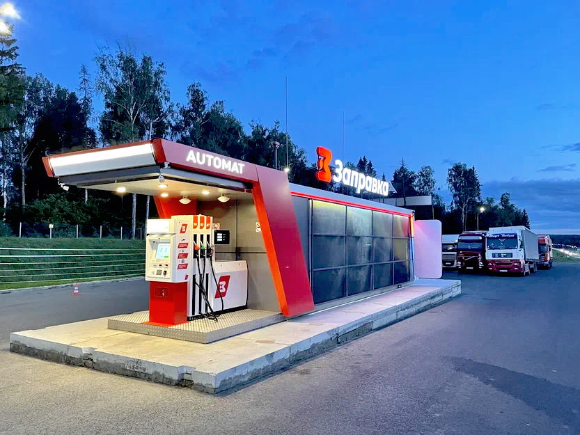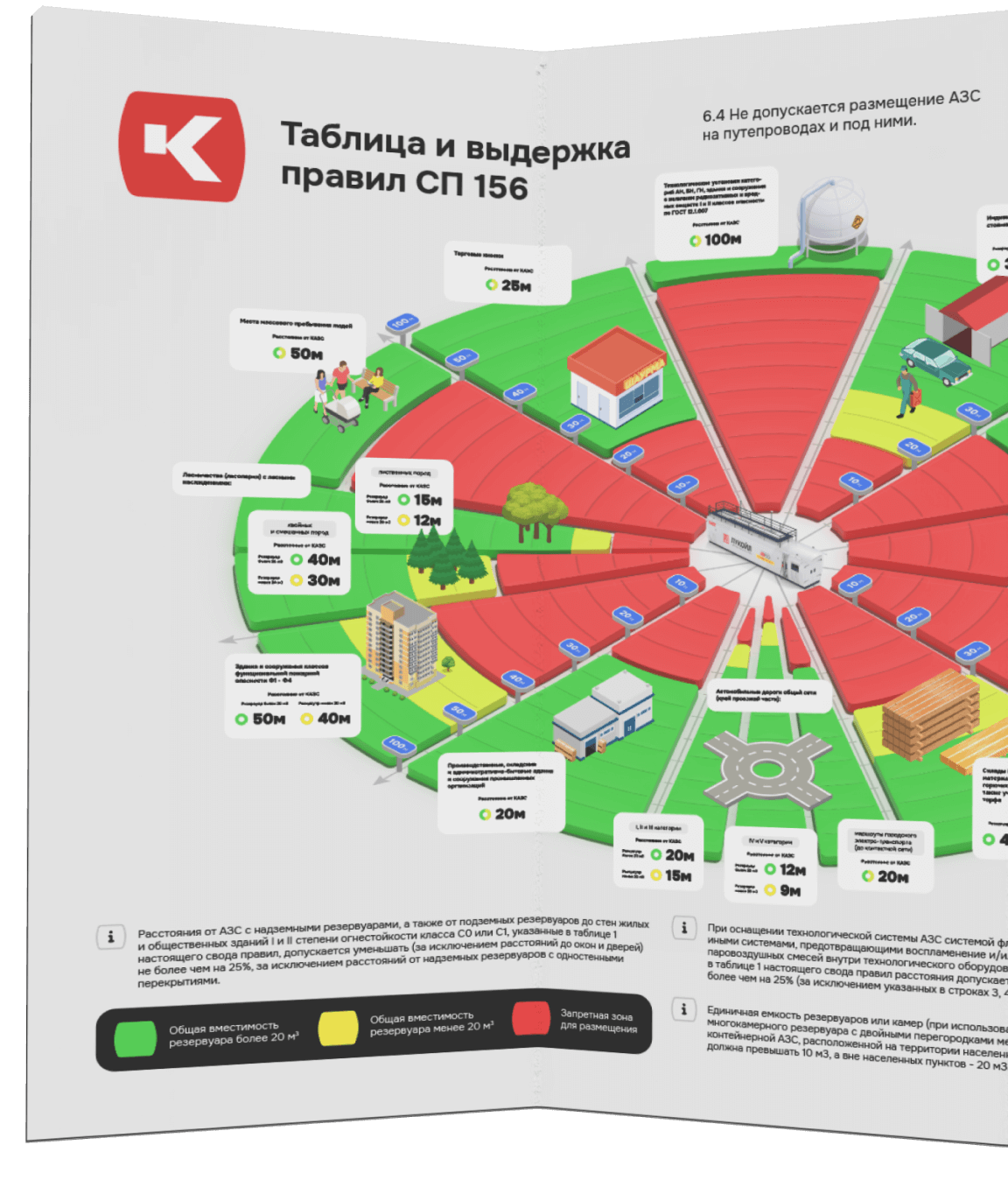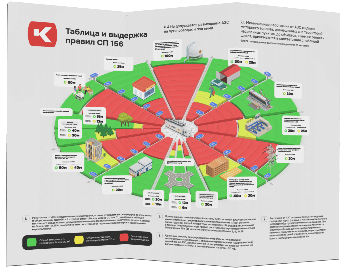 - Общий объем топлива для хранения в КАЗС. В соответствии с СП 156.13 130.2014 составляет до 60 м³ для КАЗС и до 120 м³ для модульных АЗС, в соответствии со сводом правил (Станции автомобильные заправочные. Требования пожарной безопасности". СП 156.13 130.2014). Способ отпуска топлива: оператором, автоматический по магнитным картам или через терминал самообслуживания с приемом наличных и банковских карт