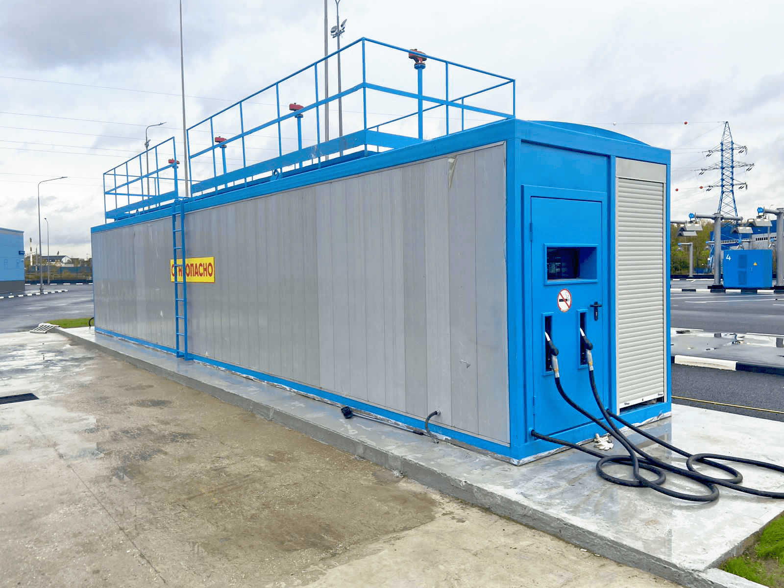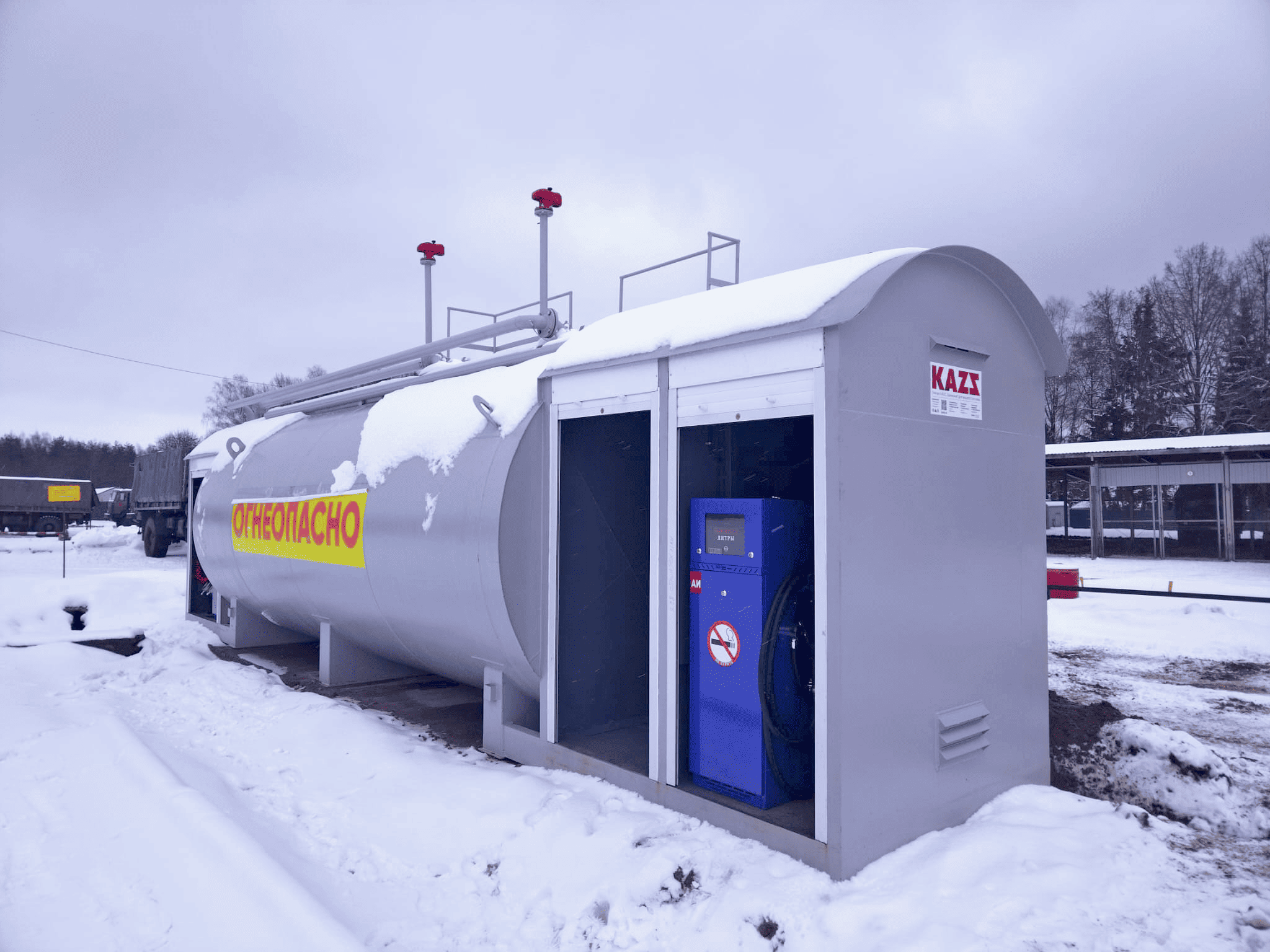 - Дополнительные опции: барабан для топливных рукавов, GSM модуль, усиление сотовой связи, утепление и обогрев резервуара, «северное» исполнение КАЗС для северных широт и т. д.